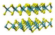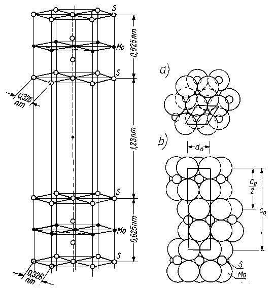 Sześciokątna forma dwusiarczku molibdenu została zastosowana w syntetycznym MoS2. Sześciokątna forma MoS2 charakteryzuje się warstwami, w której atomy molibdenu mają trójkątny pryzmatyczny wygląd i koordynują z sześcioma atomami siarki, w którym jedna płaska, sześciokątna warstwa atomów molibdenu przeplata się pomiędzy dwiema warstwami atomów siarki.